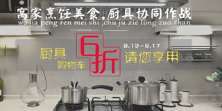 苏宁十周年店庆,窝家烹饪美食,协同作战,厨具购物车即享6折。活动包括区,烹饪锅具,厨房铲勺,刀箭砧板,厨房工具,食物保鲜,水杯水壶,厨房日杂等多个专区。活动时间截止到8月17日。