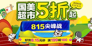 国美超市815战,全场5折起,满199减100。国美超市开启了815战,好货8.15元秒,部分商品满199减100,全场商品5-8折,超多爆款等你来挑,折后好价多多。活动包括酒水茗茶、母婴玩具、美妆个护、健康医疗等。值得关注的是活动中有0元白拿专区,不拿白不拿!另有1元疯抢区,优惠力度杠杠的,亲们快快关注起来!活动时间到8月21日止。