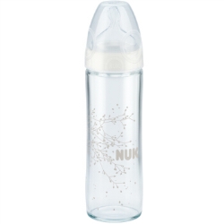 NUK宽口径防胀气玻璃奶瓶1阶段,由耐高温玻璃制成,采用德国科技,耐高温、清晰、容易刷洗,不怕刮痕;耐久性强,不需要长期更换瓶子,只需要在宝宝的生长不同阶段更换奶嘴即可;耐高温耐低温,不变形,无污染,无味道,助力宝宝健康成长。本品为宽口设计,调奶和清洗更方便;印花设计,宝宝更喜欢;流线型瓶身,方便家长持握。