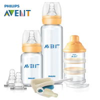 飞利浦AVENT新安怡标准口径新生儿成长奶瓶套装SCD821/00,包含标准口径玻璃奶瓶120ml/4oz(S)奶嘴 1个、240ml/8oz(S)奶瓶奶嘴 1个、奶嘴单个装(L) 1个、准口径奶嘴单个装( )1个、奶粉分装盒(黄)1个、海绵奶瓶刷奶嘴刷套装1个。