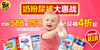 苏宁易购818发烧节,奶粉尿裤大作战,奶粉满588减150元、尿裤4折起!苏宁易购奶粉尿裤从即日起到8月13日,正限时促销中!现来苏宁易购买奶粉尿裤,奶粉全场满588-150,同时,尿裤专场尿裤4折起,还可叠加49-5元、99-10元优惠券!活动包括奶粉大牌专区、尿裤爆款专区、海外尖货专区、全品狂欢专区。