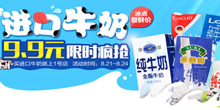 1号店进口牛奶限时疯抢中咯,全场进口牛奶9.9元起,真正的海外原装进口,产地直供,品质保证。澳大利亚德运,法国兰特,德国德亚,德国欧德堡等多个品牌参与此次活动,活动时间截止到8月24日,需要者从速哦!