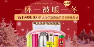 1号店保暖家居用品专场促销活动,9.9元抢,满199减100元。1号店今日开启了一个保暖家居用品的专场活动,活动页面设有9.9元暖心开抢、一杯送一被(买虎牌保温壶送价值199元冬被)、团购优选、满199元减100的专区。活动产品主要是保温杯、冬被、热水壶,虎牌、象印、南极人、博洋家纺、膳魔师等品牌都参与此次活动。活动时间为11月1日至11月4日,有需要的朋友不妨看看!
