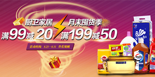 1号店月末囤货季来啦,满99减20,满199减50。活动包括满减爆款区、精选团购、纸品、洗衣除菌、家庭清洁、一次性洁具、餐具水具、厨具锅具、床品家纺、收纳家装家饰、宠物园艺、运动户外以及母婴爆款等专区。其中厨卫家居、家居家纺、运动户外,满99减20,满199减50。活动仅限北上广、成都、武汉、福建、济南覆盖地区。