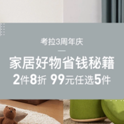 考拉海购家居超值囤货专场,2件8折/99元任选5件!活动页面设有2件8折、499减120、188减40、199减60、99选3、99选4、99选5等专区。