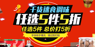 京东商城干货速食调味专场促销活动,5件5折!某东商城开启干货食品调料专场,优惠力度5件5折,活动页面商品内,任意选购5件加入购物车自动打5折,很多日常必备食品,调料折后刚需好价,适合囤货入手。