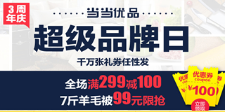 当当网超级年货节,家居日用分会场,免费领满299减100优惠券!当当网也开启了新年年货节活动,今天要给大家介绍的是家居日用分会场,全场能免费领满299减100优惠券,双人羊毛被子能99元到家。活动从1月13日到20日止,包括床品件套、枕芯枕套、烹饪锅具、厨房收纳、餐具餐盒、水杯茶具、清洁护理、收纳用品等等。有需要的亲们可以过来瞧一瞧!