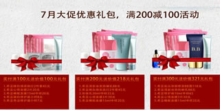 苏宁希芸感恩,回馈客户,7月大促优惠套装闪耀夺目,全场满200减100的促销活动火热进行中,实付满100送价值100元礼包,满200送价值218元礼包,满300送价值321元礼包。此次活动有美白防晒,水漾补水,魅力彩妆等多款超值护肤套装参与,另有多款特价单品供你选择,这次活动不需领券,直接满减,十分给力!