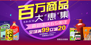 为为网喜迎国庆65周年,0元商品免费领 满99元减20元,还设有N件N元四个分会场(食品类65元6件、周四周五日用类65元3件、周六周日美妆类65元2件、周一母婴类165元2件),活动截止日期为9月15日,这次活动力度还是很大的,小伙们,开始你们的疯狂购吧!