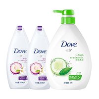 Dove多芬清透水润沐浴乳1000ml+衡悦水润沐浴乳300ml*2瓶 ,全新清透水润配方,蕴含清新黄瓜与绿茶的舒爽香氛,触感沁透轻盈,带给肌肤清爽水润感。含有突破性Nutrium Moisture,亲肤滋养因子与您肌肤的天然滋养成分相似,更易深层吸收,由内而外滋养每寸肌肤,令洗后肌肤触感饱满,分外美丽。