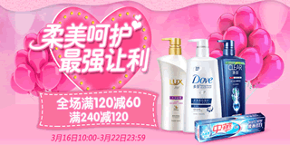 京东商城3月柔美呵护,洗护用品强让利,全场满120减60元,满240减160元!活动时间从2015.3.16-2015.3.22,活动包括:热卖套装专区、身体护理专区(女士沐露、男士沐露、皂块)、秀发护理专区(洗发、护发、套装)、口腔及女性护理专区(牙膏、牙粉、牙刷、牙线、漱口水)以及更多精彩活动等你来参与!本次活动囊括了各大知名品牌,有多芬、力士、清扬、凌仕、舒耐、佳洁士、中华、高露洁等等。洗护用品是生活必备品,也是易耗品,本次京东的活动优惠力度还比较的大,有需要的朋友可以来瞧一瞧!