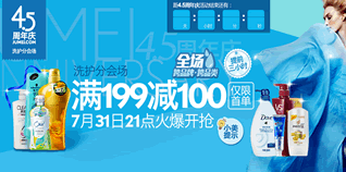 聚美优品4.5周年庆,洗护用品分会场,参加活动的品牌有施华蔻、沙宣、资生堂菲婷、欧莱雅、苏菲等,活动力度为满199元减100元,仅限首单。有需要买洗护用品的朋友可以看看。