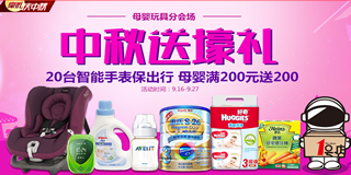 1号店母婴玩具分会场,中秋送豪礼,母婴满200元送200,还有抽奖活动哦!一号店现正在开展母婴优惠专场活动,20台智能手表保出行,母婴满200元即送200哦!活动期间,自营母婴实付200元送200元券,包括满100减10元的奶粉券、满200减20元纸尿裤券、满258减25元的母婴券、满200减100元的童车优惠券!活动期间,购买自营母婴商品满68元可以参加抽奖1次,每个ID限抽1次,中奖机率70%!奖品有限,发完为止哦!活动时间:9月16日——9月27日!