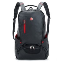 SWISSGEAR瑞士军刀黑色双肩电脑包SA7717,采用PU材质和全身性防水面料,底部设有专门存放鞋子的拉链袋,可放14寸、15寸笔记本电脑。男女通用。人性化设计背负可改善背部空气流通和加强腰部的支持,舒适、宽阔的肩带设计,能优化平均分配所承受的重量。