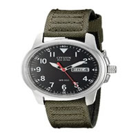 采用类似飞行员表款的设计,12点钟方向倒三角设计,夜光也很炫目,有德味的哑光炭黑色表盘也很有特色,带夜光的白色指针和数字刻度搭配撞红色秒针,整体效果较骚。机芯是CITIZEN擅长的Eco-Drive光动能石英机芯,吸收日常可见光作为能量来源,终身无需更换电池。表盘直径37mm,厚度9mm,3点钟方向带有星期和日历双显,耐磨帆布表带,防水达到100米。
