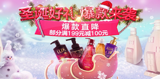 亚马逊中国联合利华圣诞狂欢,美容化妆满199-100!亚马逊中国个护美妆圣诞好礼活动,领取优惠码【ULB199G100】可满199减100(爆款直降区不参与),在商品详情页价格下方领取优惠券即可,爆款直降,包括多芬、清扬、夏士莲等品牌均有参与,另有礼品相送。