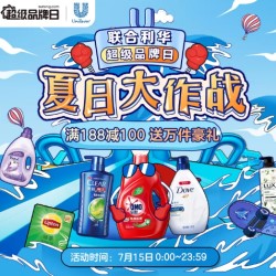 苏宁联合利华超品日,满99减50,满188立减100,爆款满88送49元大礼包,满39送20元礼包,活动仅限7.15日一天。