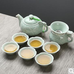 苏氏陶瓷青釉瓷功夫茶具套装,精选高岭土,经1250℃至1400℃高温烧制,荷叶形茶碗瓷质温润细腻,碗内浮雕图案,使整个茶具更加具有造型感,手感舒适纤柔。