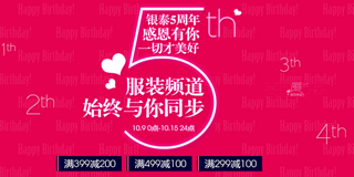 银泰网五周年店庆,服装频道感恩回馈,满399减200、满499减100、满299减100!银泰网五周年之际,服饰、母婴、鞋靴、生活用品等会场纷纷开展感恩回馈活动,更多优惠来袭哦!在银泰网服装频道中,推出更多满减优惠!服装会场分为满399元减200元、满499元减100元、满299元减100元等满减分会场,还有品牌满减专区哦!活动时间:10.9——10.15!