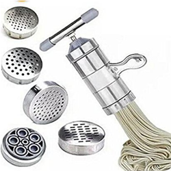 Moonyland不锈钢家用手动面条机,5种不同造型的模具头造型,能做出多种面条造型,更换模具头简单方便妈妈也可以轻松操作了。不锈钢机身光洁内壁,耐压力,增强寿命,易清洗。
