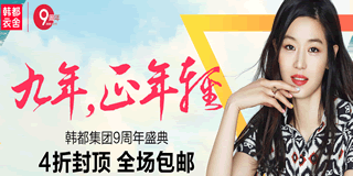 韩都衣舍9周年盛典,美丽正年轻,全场包邮,4折封顶!活动5月8号10点 准时开抢!全场登录即享4折封顶,领券还享折上折,满259件50!满359减100!满599减200!满799减300!领券请点击此处!还可参与【9周年明星计划】,即有机会获得100无门槛红包哦!无门槛的哦,100元哦!各种省钱妙招让你爽到爆!会员还有专享券+签到赚积分+叠加满减,更加优惠哟!本次韩都衣舍9周年盛典的玩法颇多,撕明星名牌获红包口令+5月生日同庆祝+成为韩都星女郎!送!送!送!定制防晒服!时尚字母帆布包!水果沙冰机!送不停!周年庆款、爆款专区、特价清仓专区、99元封顶专区敬请期待!