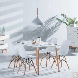 TIMI天米现代简约餐桌椅组合套装,采用高密度板烤漆桌面搭配实心榉木桌腿,桌面采用无毒烤漆工艺,三层底漆两层面漆,触感细腻,表面光滑,耐热抗划伤,既美观又易清洁。椅子采用榉木腿与钢筋的交叉结构,更加稳定。椅面选用聚丙烯材质,设计贴合人体曲线,坐感舒适。防刮脚垫设计,保护地板同时增强稳定性。整体设计为北欧简约风格。桌子尺寸为:120*80*75cm,椅背高82cm,椅面离地45cm。