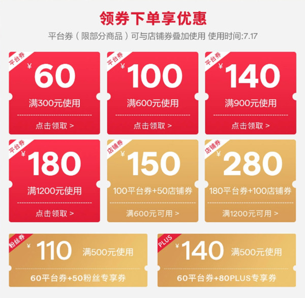 店铺券叠加平台券后满600减150,满280减180,粉丝叠券满500减110,PLUS满500减140。整点还可抢100-50,200-100元优惠券,实付满额送精品潮袜。