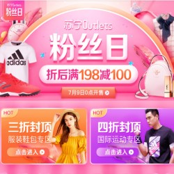 苏宁易购Outlets粉丝日,服装鞋包专区3折封顶,国际运动专区4折封顶,折后满198减100,7.9日0点开售。
